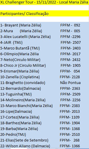 Aconteceu neste dia 15 de novembro em comemoração a Proclamação da República o 40ڃ Challenger da FPFM na sede da S.A.V. Maria Zélia e a vitória foi de Bryant da equipe sede.