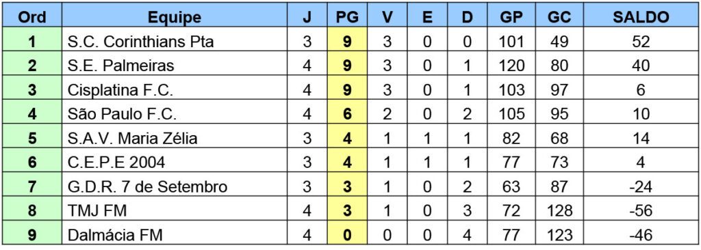 S.C. Corinthians Paulista x TMJ FM parciais – 10×0, 6×4, 8×2, 10×0 e 8×2 placar final 42 x 8 para o Corinthians.