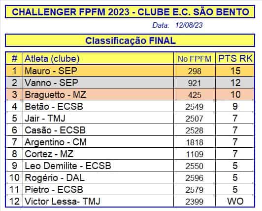 Reunidos 12 atletas federados na sede do BFA na capital paulista com a organização do Esporte Clube São Bento tivemos neste dia 12 de agosto de 2023 a realização de mais um “Challenger” da FPFM onde o Atleta Mauro as SE Palmeiras sagrou-se campeão, confira como ficou a classificação final: