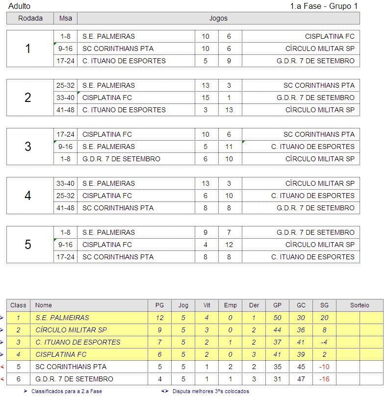 | S.E. PALMEIRAS | 5 | 11 | CÍRCULO MILITAR SP | |||||||||