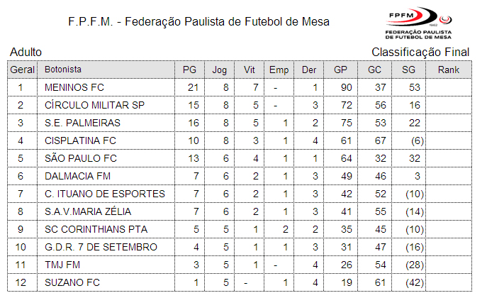 | S.E. PALMEIRAS | 12 | 4 | S.A.V.MARIA ZÉLIA | ||||||||