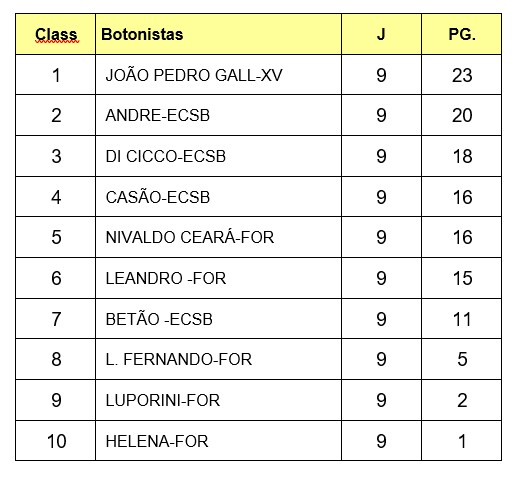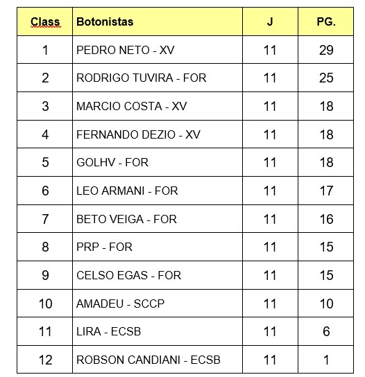 Com a participação de 12 atletas na primeira divisão e 10 na segunda divisão, aconteceu em Botucatu neste sábado dia 16 de julho, sob o comando dos representantes, PRP e Beto Veiga, as taças do interior, onde Pedro Neto do XV de Agosto de Socorro, faturou a primeira divisão, a classificação final ficou assim: